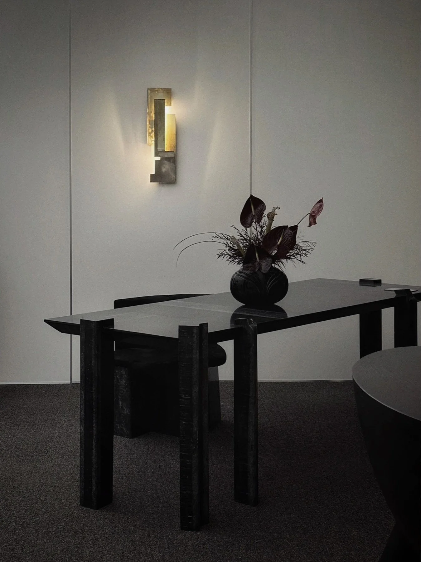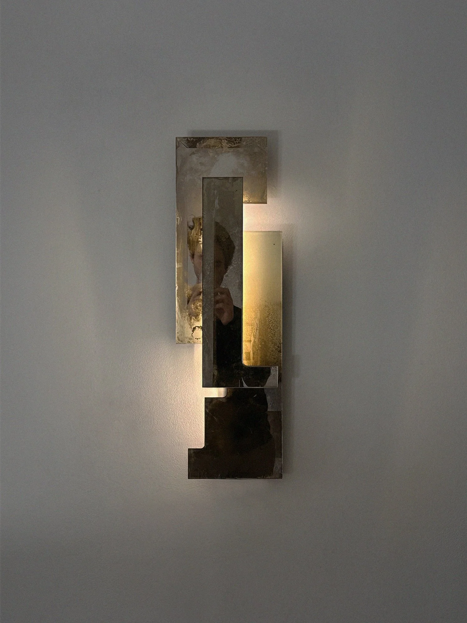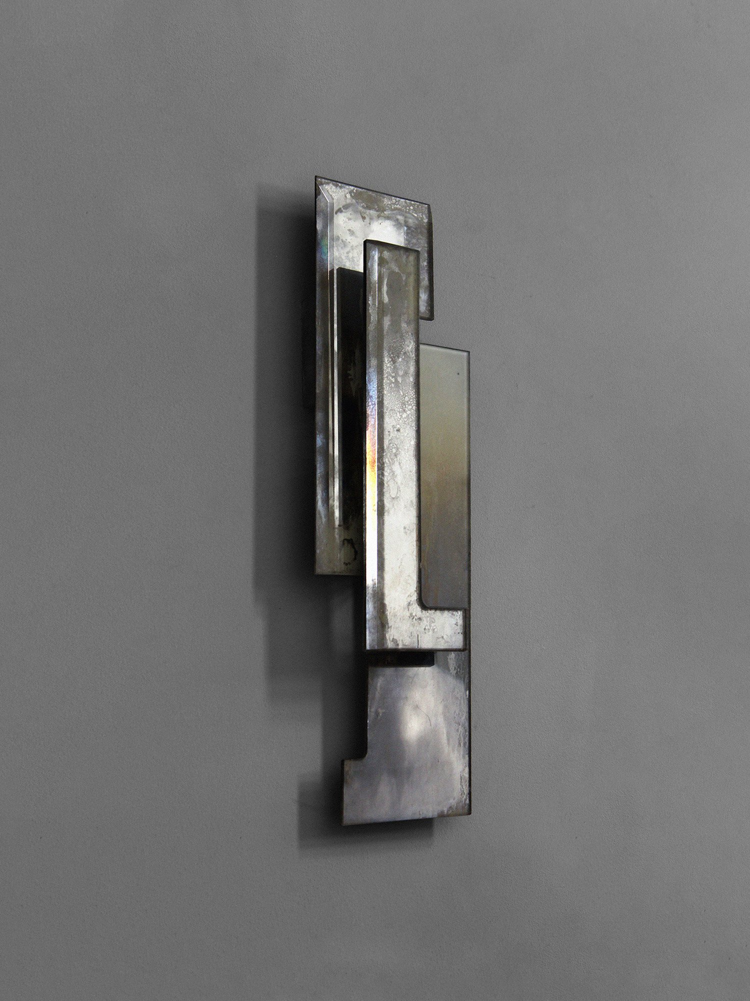 Hand-silvered wall lighting object. Series of unique works. Each lighting object, composed of glass elements, is treated with Boldizar Senteski's signature silvering technique. These fragments are assembled into a singular whole, their surfaces hand-silvered and alloyed.
